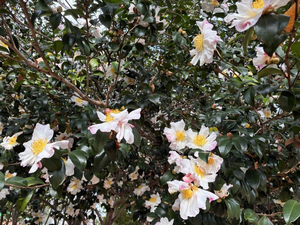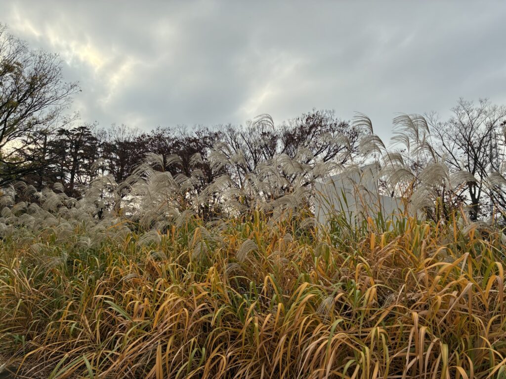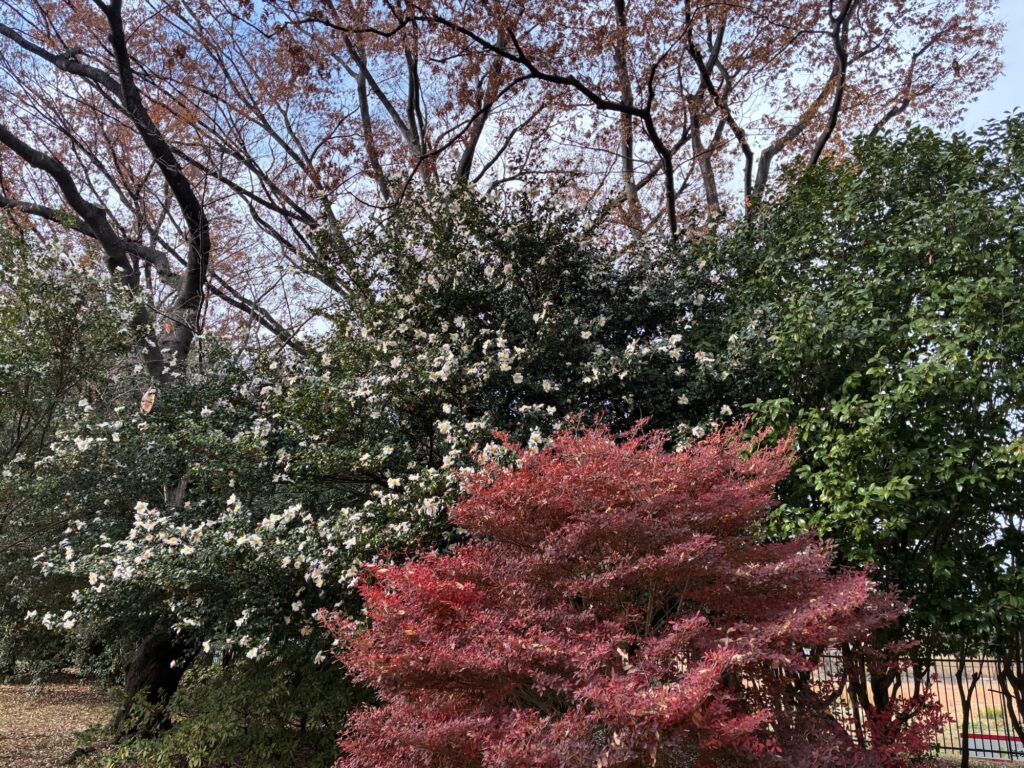 じゃぶじゃぶ池へ向かう途中、梅林の向かいにはススキの近くには椿のような低木や常緑樹もあり、“秋と冬が混ざる季節のグラデーション”が楽しめます。